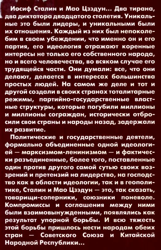 В драматической истории XX столетия И. Сталин и Мао Цзэдун занимают особое место. Лидеры двух великих держав, ввергшие свои народы в пучину глубочайших потрясений, эхо которых не угасло по сей день… Их взаимоотношения были крайне сложными. В большой политической игре нашлось место и взаимным подозрениям, и интригам, и вероломству. В своей книге виднейший российский китаевед, автор многочисленных публикаций по новейшей истории Китая Юрий Михайлович Галенович подробно раскрывает подоплеку событий 1940—1950-х гг., показывая сложность и противоречивость того времени, всю неоднозначность мотивов и поступков вождей, вершивших судьбы сотен миллионов своих сограждан.