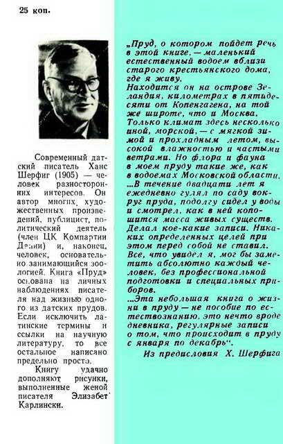 Каждый день, в любую погоду пожилой человек в очках прогуливается около маленького пруда неподалеку от его дома. Подолгу стоит у воды, иногда вылавливает кого-нибудь из жителей пруда, помещает в аквариум или кладет под микроскоп… И так из месяца в месяц, из года в год. Умело приправив свои собственные наблюдения сведениями из научной литературы, известный датский писатель Ханс Шерфиг написал эту небольшую, но добрую и мудрую книгу, понятную и интересную каждому.