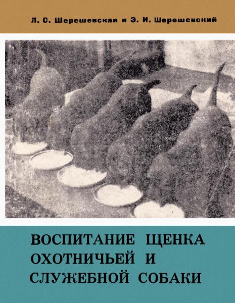 Любовь Соломоновна Шерешевская и Эдуард Иосифович Шерешевский Воспитание щенка охотничьей и служебной собаки Средне-Уральское Книжное Издательство, Свердловск, 1969 Авторы книги — специалисты-кинологи — делятся своим большим опытом по выращиванию и воспитанию щенков в индивидуальных условиях. В книге рассказывается как о содержании и кормлении щенков охотничьих и служебных собак, так и о первоначальной общей дрессировке. Книга рассчитана на любителей-собаководов, членов обществ охотников и клубов служебного собаководства. Редактор В. Бахмутова Художественный редактор Я. Чернихов Технический редактор К. Проскурникова Корректор Ю. Литвиненко Сдано в набор 30/IX 1968...