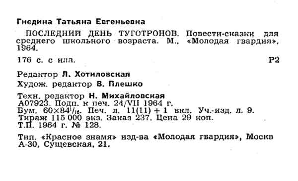 В сборник вошли две фантастические повести (издательство определило их как повести-сказки): Последний день туготронов — в которой обычный школьник, с помощью необычного средства межпланетных сообщений, попадает на планету, населенную роботами — туготронами и маленькими человечками — минитаками. Вторая повесть — Острова на кристаллах воображения, рассказывает об удивительной встрече семиклассника Сёмы с людьми, нашедшими, с помощью капитана Немо, спасение на островах подземного моря. Примечание: Как вспоминала Татьяна Евгеньевна в 2007 году: «После Стругацких, это мое мнение, уровень русской фантастики очень упал. Там ведь два направления сейчас – как раз...