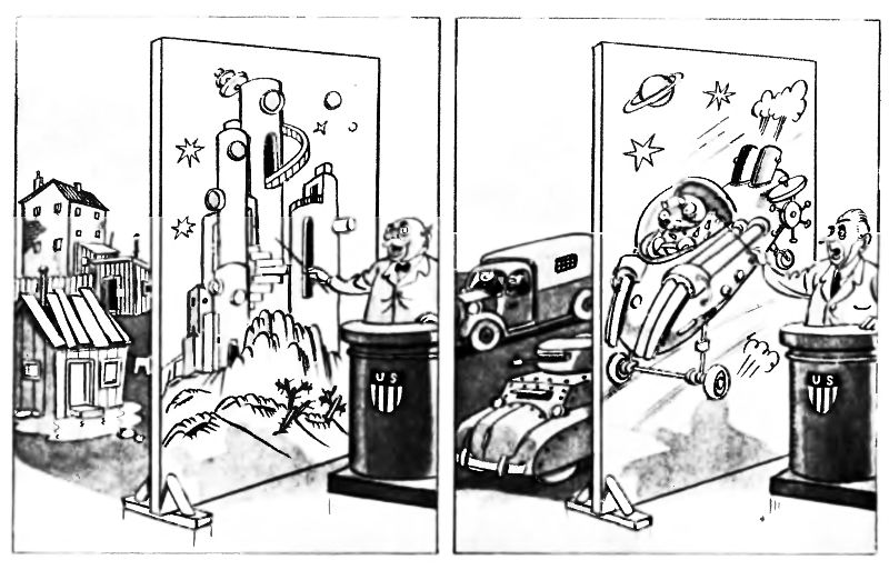 Торговля с метанийцами — настоящий бизнес! Рисунок Ю. Ганфа. Иллюстрации из «Popular Science» № 10, 1952 г. Из журнала «Техника — Молодежи» № 6, 1954 г.