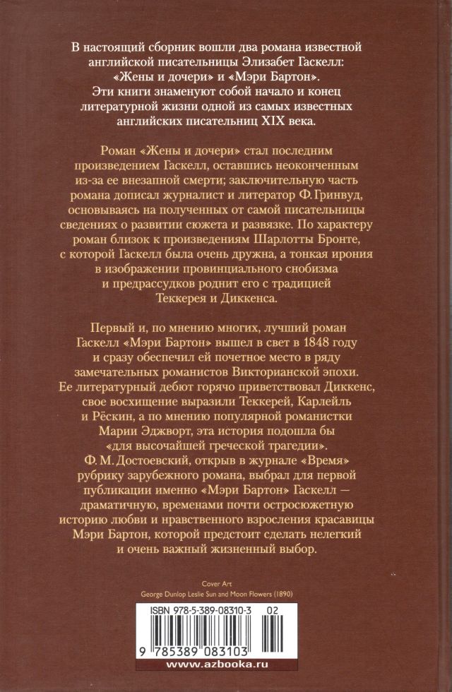 В сборник вошли два романа известной английской писательницы Элизабет Гаскелл: «Жены и дочери» и «Мэри Бартон». Эти книги знаменуют собой начало и конец литературной жизни одной из самых известных английских писательниц XIX века. Роман «Жены и дочери» стал последним произведением Гаскелл. По характеру роман близок к произведениям Шарлотты Бронте, с которой Гаскелл была очень дружна, а тонкая ирония в изображении провинциального снобизма и предрассудков роднит его с традицией Теккерея и Диккенса. Первый и, по мнению многих, лучший роман Гаскелл «Мэри Бартон» вышел в свет в 1848 году. Драматичная, временами почти остросюжетная история любви и нравственного взросления красавицы Мэри...