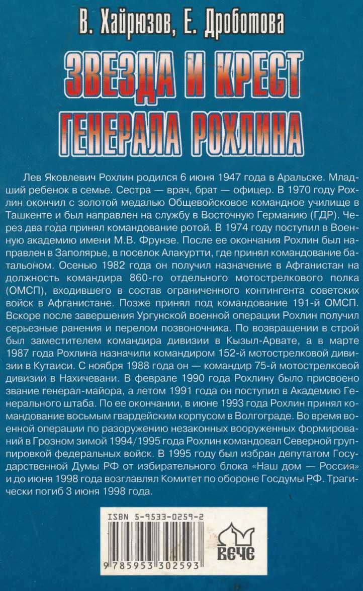 Новый роман известного писателя Валерия Хайрюзова и журналистки Елены Дроботовой — весьма необычное произведение. Жесткая публицистика здесь причудливо и органично переплетается с художественным домыслом. Яркая и трагическая фигура генерала Рохлина предстает перед читателями в совершенно новом свете. Кто он: предатель или ангел-освободитель? бунтовщик или мессия? была ли его гибель случайной или предопределенной судьбой? Об этом и о многом другом, связанном с личностью генерала Рохлина любознательный читатель сможет узнать из этой скорбной и одновременно захватывающей книги.