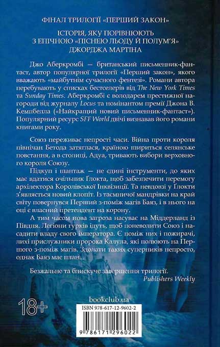 Союз переживає непрості часи. Війна проти короля північан Бетода затяглася, країною шириться селянське повстання, а в столиці, Адуа, тривають вибори верховного короля Союзу. Підкуп і шантаж — не єдині інструменти, до яких має вдатися очільник Ґлокта, щоб забезпечити перемогу архілектора Королівської Інквізиції. Та невдовзі у Ґлокти з’являється новий клопіт. З таємничої мандрівки на край світу повернувся Перший з-поміж магів Баяз, і в нього на оці є власний претендент на корону. А тим часом нова загроза насуває на Міддерланд із Півдня. Легіони гурків йдуть, щоб поневолити Союз і насадити владу свого імператора. Є поміж них і пожирачі, лихі прислужники пророка Калула, які полюють на...