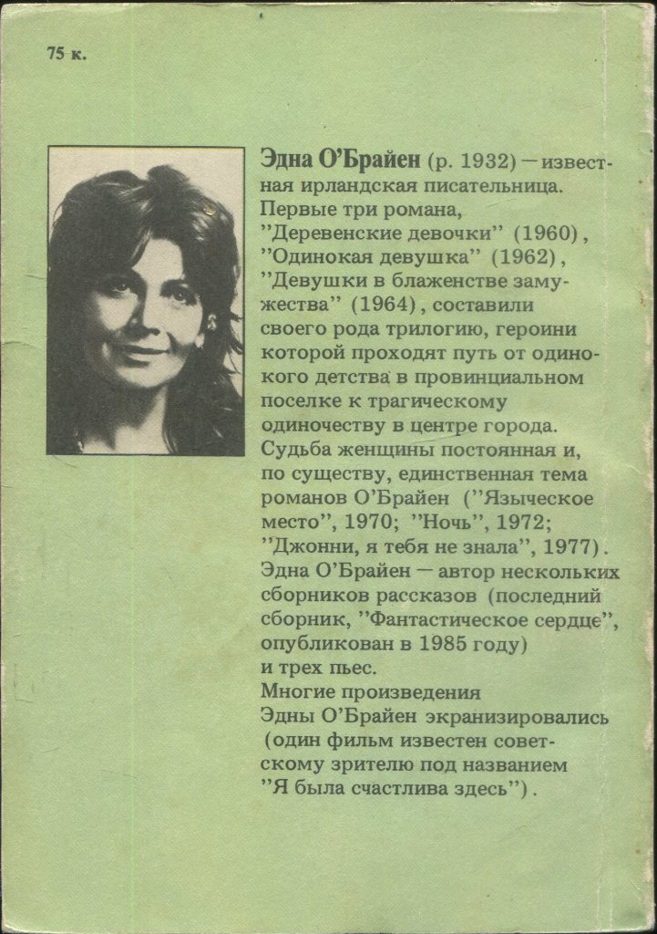 Опубликовано в журнале «Иностранная литература» № 9, 1978 Из рубрики "Авторы этого номера" ...Перу Эдны О'Брайен принадлежит еще семь романов (на экранах Советского Союза демонстрировался фильм «Я была так счастлива здесь», снятый по одному из них) и два сборника рассказов: «Предмет любви» («The Love Object». London, 1968) и «Женщина скандального поведения» («A Scandalous Woman», London, 1974). Предлагаемые рассказы взяты из первого сборника.