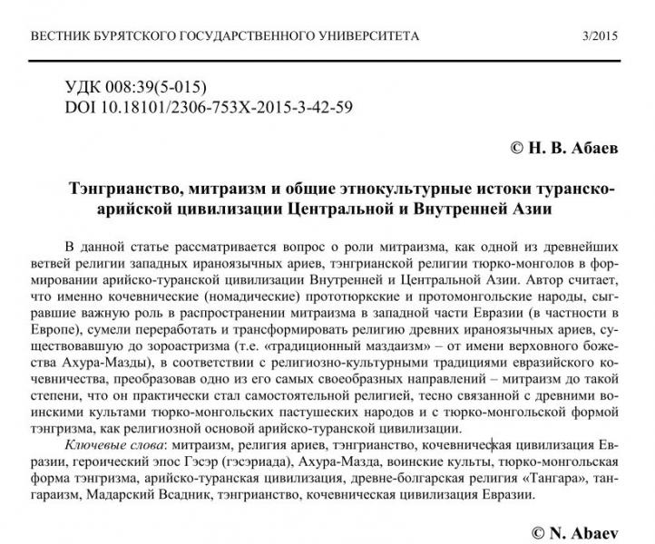 Тэнгрианство, митраизм и общие этнокультурные истоки туранско- арийской цивилизации Центральной и Внутренней Азии