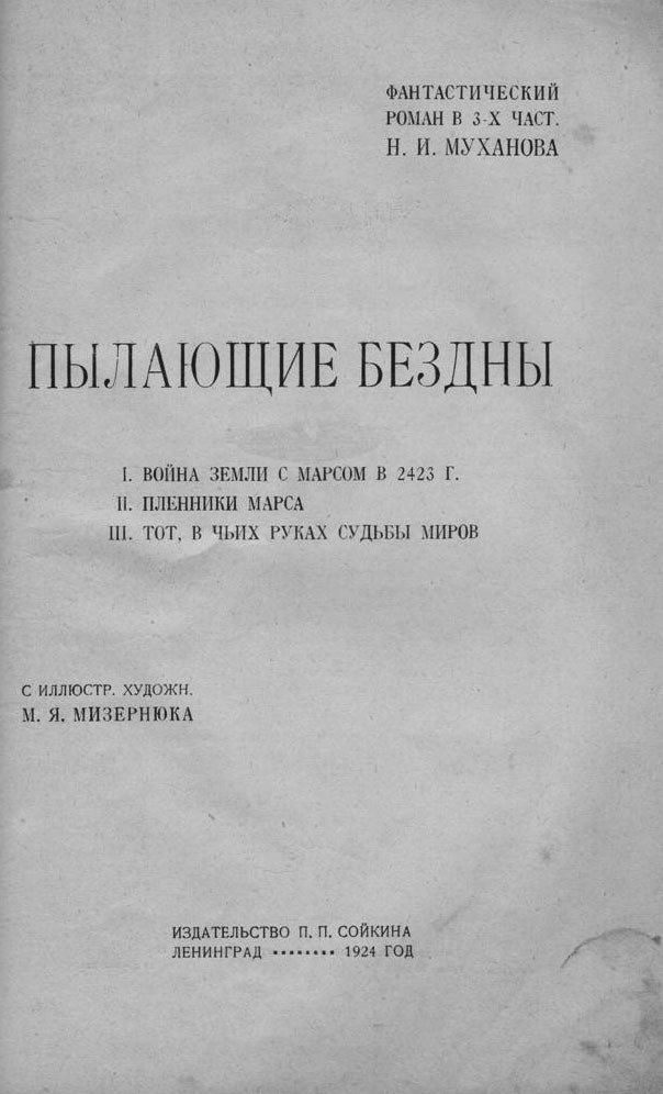 ...Во многих пунктах Земли и Марса кипел ад… Атмосфера обеих планет была раскалена до чрезвычайности. Титанические постройки лежали в развалинах… Живые существа закапывались глубоко в каменные недра... Кто сейчас помнит созданную в 1924 году космическую оперу Николая Муханова «Пылающие бездны» о войне Земли с Марсом в 2423 году? Сражения космических флотов, разрушительное лучевое оружие массового уничтожения, изменение скорости движения планет.... А вот цитата из третьей главы первой части: ...Молодая женщина, полулежа в удобном кресле, читала книгу, — т. е., перед марсианкой, отпечатываясь на особом экране, [...]протекали живыми нитями мысли автора, стройные...
