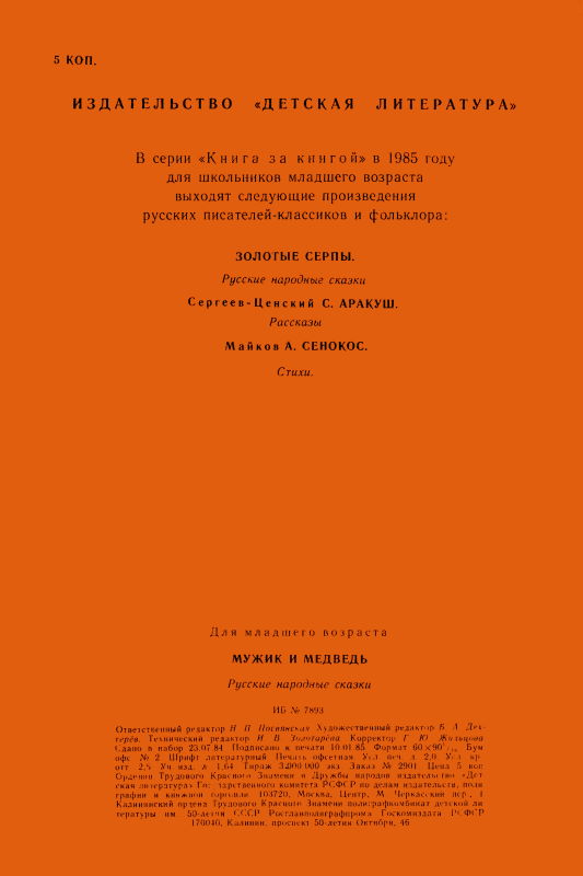 В книжку вошли русские народные сатирические сказки. Их герой — простой русский мужик, труженик. Иллюстрация на обложке и внутренние иллюстрации Н. Шеварева. [collapse collapsed title=Содержание] Лисица и тетерев (сказка, перевод Л.Н. Толстого), стр. 3-4 Лиса и дрозд (сказка, перевод А.Н. Толстого), стр. 4-6 Лиса и рак (сказка, перевод А.Н. Толстого), стр. 6 Мальчик с пальчик (сказка, перевод А.Н. Толстого), стр. 7-8 Лев, щука и человек (сказка, перевод А.Н. Толстого), стр. 9 Мужик и медведь (сказка, перевод А.Н. Толстого), стр. 10 Маша и медведь (сказка, перевод М....