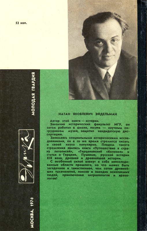Натан Яковлевич Эйдельман – историк, литературовед, писатель, публицист, чей вклад в отечественную историографию XX века трудно переоценить. Он оставил богатейшее творческое наследие – более 20 книг и многочисленные статьи, эссе, рецензии в периодической печати. Основной областью научных интересов Н. Я. Эйдельмана была история русской культуры и общественного движения в XVIII-XIX веках. В книгах «Твой восемнадцатый век» и «Твой девятнадцатый век» рассказывается об интереснейших событиях русской истории: дворцовых переворотах, Пугачевском бунте, освоении Камчатки и Курил, Отечественной войне 1812 года, восстании на Сенатской площади в Петербурге, отмене крепостного права и др.; герои этих...