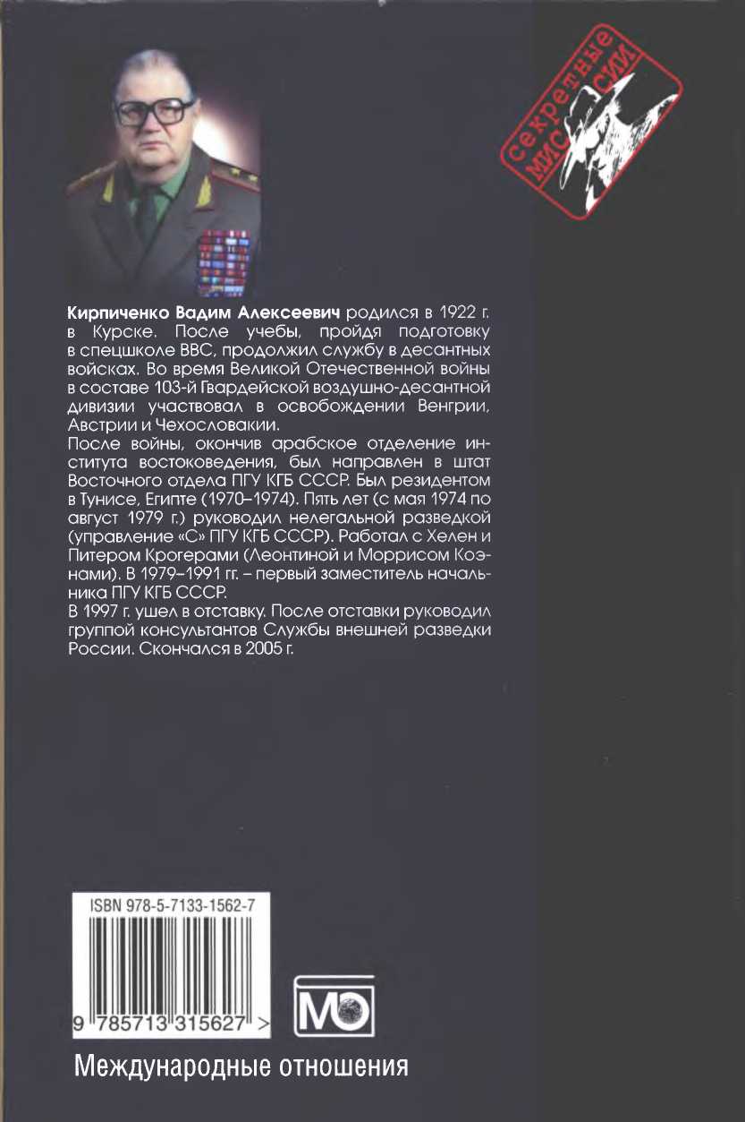 Предыдущие издания этой книги уже получили высокую оценку и у широкого читателя, и в профессиональной среде: В. А. Кирпиченко был удостоен звания лауреата премии Службы внешней разведки России за лучшее произведение в области литературы и искусства о российской внешней разведке. Продолжительное пребывание у руля этой службы (в 1979–1991 гг. В. А. Кирпиченко был первым заместителем начальника ПГУ КГБ СССР) позволило автору создать галерею запоминающихся портретов разведчиков, включая руководителей КГБ и иностранных разведок, не известных ранее героев и скандально известных предателей. Наряду с этим в книге открываются подлинные факты, лежавшие в основе многих драматических эпизодов...