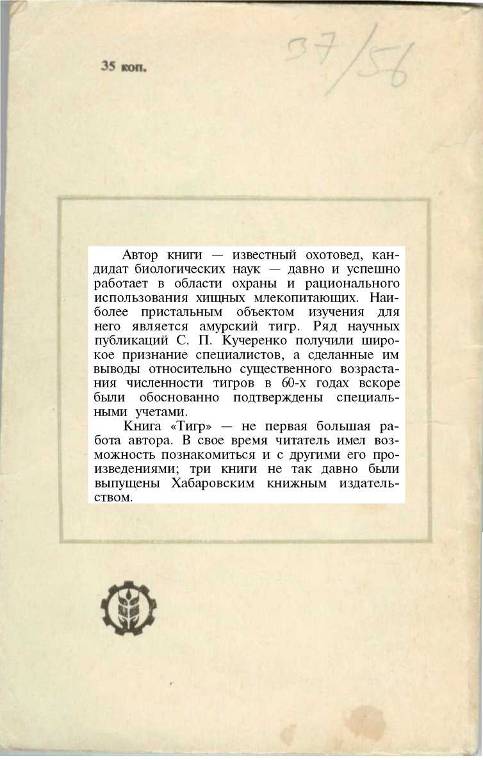 Автор книги — известный охотовед, кандидат биологических наук — давно и успешно работает в области охраны и рационального использования хищных млекопитающих. Наиболее пристальным объектом изучения для него является амурский тигр. Ряд научных публикаций С. П. Кучеренко получили широкое признание специалистов, а сделанные им выводы относительно существенного возрастания численности тигров в 60-х годах вскоре были обоснованно подтверждены специальными учетами. Книга «Тигр» (1985г.) — не первая большая работа автора. В свое время читатель имел возможность познакомиться и с другими его произведениями; три книги не так давно были выпущены Хабаровским книжным издательством. Книга...