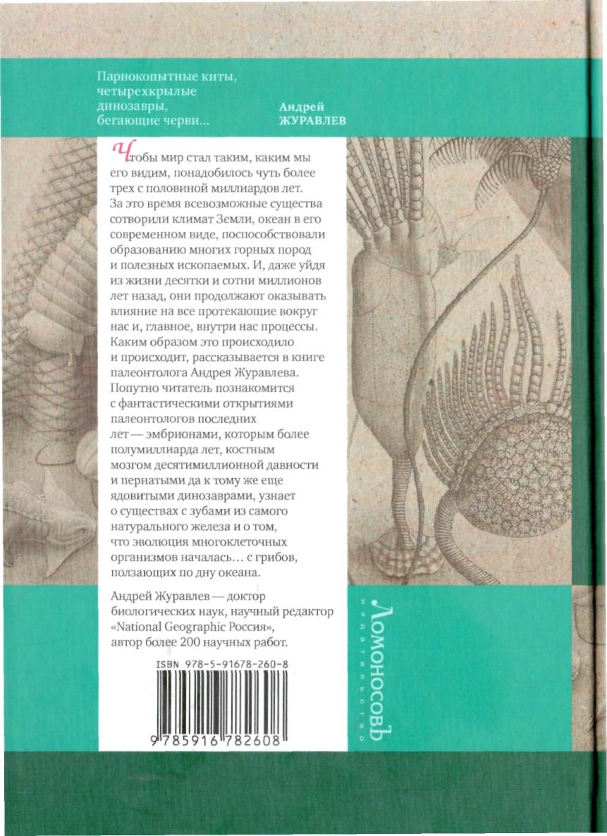 Чтобы мир стал таким, каким мы его видим, понадобилось чуть более трех с половиной миллиардов лет. За это время всевозможные существа сотворили климат Земли, океан в его современном виде, поспособствовали образованию многих горных пород и полезных ископаемых. И, даже уйдя из жизни десятки и сотни миллионов лет назад, они продолжают оказывать влияние на все протекающие вокруг нас и, главное, внутри нас процессы. Каким образом это происходило и происходит, рассказывается в книге палеонтолога Андрея Журавлева. Попутно читатель познакомится с фантастическими открытиями палеонтологов последних лет — эмбрионами, которым более полумиллиарда лет, костным мозгом десятимиллионной давности и пернатыми...