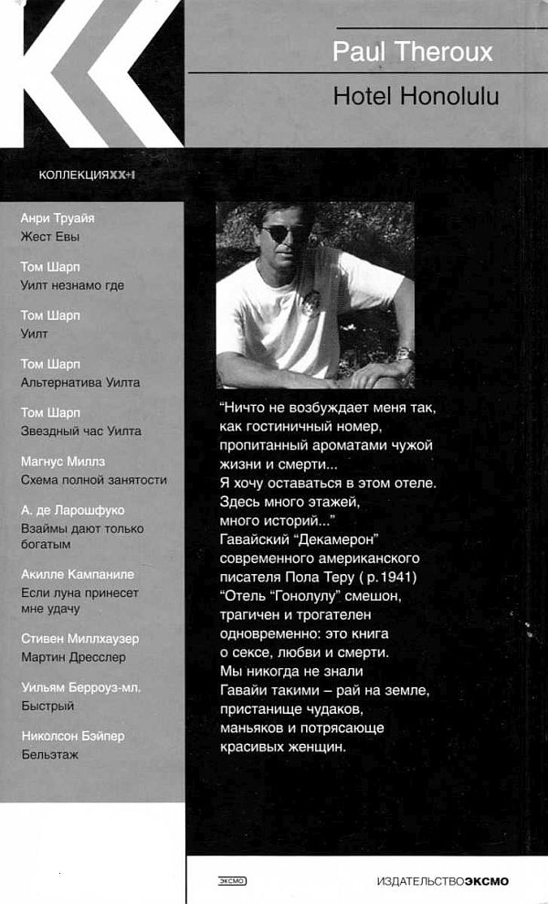 «Ничто не возбуждает меня так, как гостиничный номер, пропитанный ароматами чужой жизни и смерти… Я хочу оставаться в этом отеле. Здесь много этажей, много историй…» Гавайский «Декамерон» современного американского писателя Пола Теру (р. 1941) «Отель „Гонолулу“» смешон, трагичен и трогателен одновременно: это книга о сексе, любви и смерти. Мы никогда не знали Гавайи такими — рай на земле, пристанище чудаков, маньяков и потрясающе красивых женщин.
