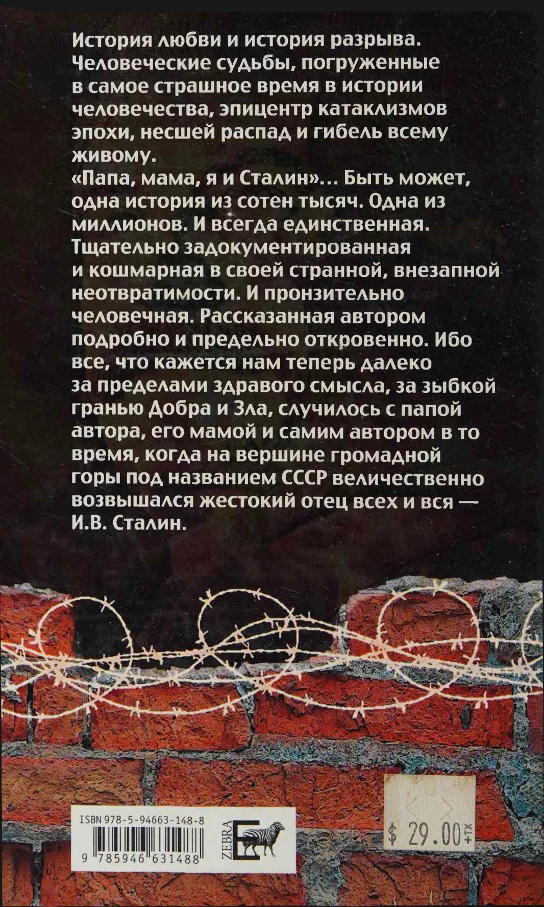 История любви и история разрыва. Человеческие судьбы, погруженные в самое страшное время в истории человечества, эпицентр катаклизмов эпохи, несшей распад и гибель всему живому. «Папа, мама, я и Сталин»… Быть может, одна история из сотен тысяч. Одна из миллионов. И всегда единственная. Тщательно задокументированная и кошмарная в своей странной, внезапной неотвратимости. И пронзительно человечная. Рас сказанная автором подробно и предельно откровенно. Ибо все, что кажется нам теперь далеко за пределами здравого смысла, за зыбкой гранью Добра и Зла, случилось с папой автора, его мамой и самим автором в то время, когда на вершине громадной горы под названием СССР величественно возвышался...