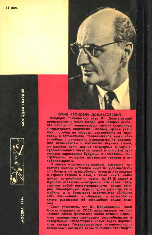 Долматовский Ю. А. Автомобиль за 100 лет. — М.: Знание, 1986. — 240 с., ил. 1 р. 10 к. 150 000 экз. Автор рассказывает о развитии автомобиля за 100 лет со дня изобретения. Читатель узнает о машинах-предшественинцах, об изменениях и усовершенствованиях конструкций, о роли автомобильного транспорта в народном хозяйстве и о применении его в первой и второй мировых войнах. На основе изучения тенденций развития автомобиля в книге рассказывается о его дальнейших перспективах. Рассчитана на широкий круг читателей.