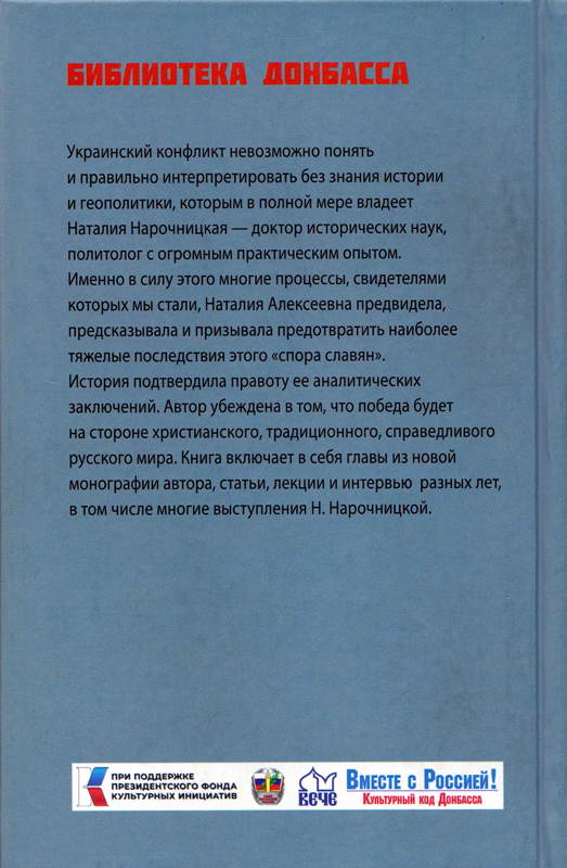 Украинский конфликт невозможно понять и правильно интерпретировать без знания истории и геополитики, которым в полной мере владеет Наталия Нарочницкая — доктор исторических наук, политолог с огромным практическим опытом. Именно в силу этого многие процессы, свидетелями которых мы стали, Наталия Алексеевна предвидела, предсказывала и призывала предотвратить наиболее тяжелые последствия этого «спора славян». История подтвердила правоту ее аналитических заключений. Автор убеждена в том, что победа будет на стороне христианского, традиционного справедливого Русского мира. Книга включает в себя главы из новой монографии автора, статьи, лекции и интервью разных лет, в том числе многие выступления...