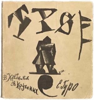 По словам М. Матюшина, «весной 1913 г., еще при жизни Гуро, был задуман сборник „Трое“, где она должна была выступить со своими друзьями Хлебниковым и Крученых. Этот сборник вышел уже после смерти Гуро, с обложкой и рисунками К. Малевича, посвященными ее памяти». Творчество Е. Гуро представлено в сборнике впервые публиковавшимися стихотворениями и прозаическими отрывками. Остальную часть сборника поделили между собой В. Хлебников и А. Крученых. Последний, кроме подборки своих стихотворений, поместил программную статью «Новые пути слова». Тираж 500 экз. https://ruslit.traumlibrary.net