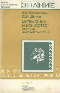 Москва: Знание. 1976. 65 с. В брошюре рассказывается об одной из сложнейших проблем, стоящих на стыке гуманитарных и точных наук, — поискам новых научных методов в поэтике, предлагаемая модель намечает пути изучения механизмов, связываемых смысл художественного текста с его воплощением, открывает новые возможности в области художественного перевода. Брошюра рассчитана на читателя, интересующегося вопросами математизации и кибернетизации гуманитарных наук.