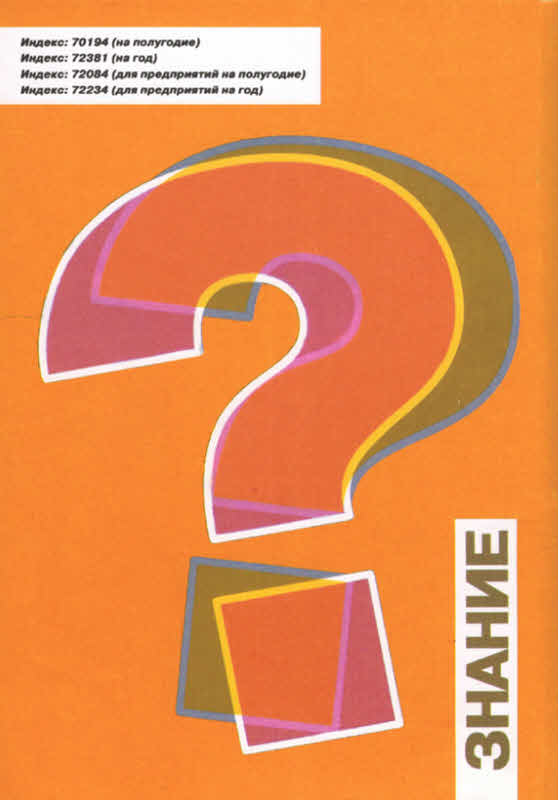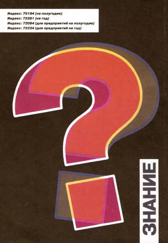 «Они» летают по туннелям? Легко ли отыскать следы Афанасия Никитина? Нострадамусу диктовала Вселенная? Поляризуемся по профессионализму? Нет уму покоя от близнецов? Человечество расселится по-научному? Когда взойдут Гиады? — Об этом и многом другом вы можете прочитать в № 1 журнала. Для массового читателя. * * * Подписная серия «Знак вопроса» издательства «Знание» выпускалась ежемесячно, начиная с 1989 года. Основная тематика серии — аномальные явления, необъяснимые феномены, загадки истории, оригинальные гипотезы. Появившись в последние годы существования СССР, серия предвосхитила перестроечный вал подобных публикаций, однако выгодно отличалась от них советским...