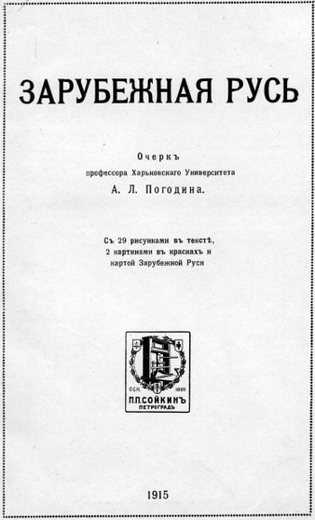 Очерк профессора Харьковского университета А. Л. Погодина о русских в Галиции и Буковине. Серия «Знания для всех». Санкт-Петербург, типография П. П. Сойкина, 1915.