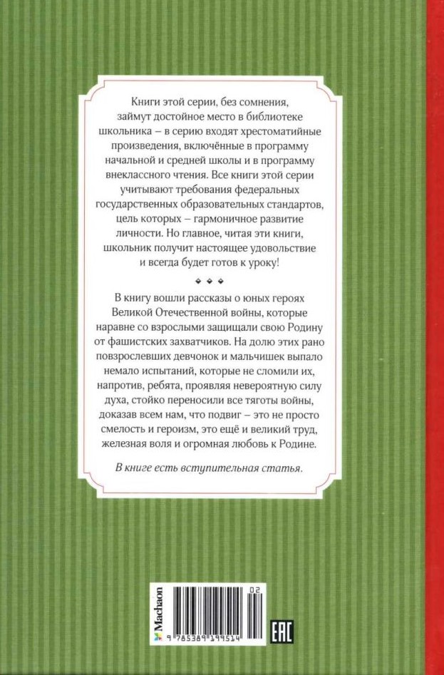 Во время Великой Отечественной войны дети, ровесники современных подростков, наравне со взрослыми защищали свою Родину от фашистских захватчиков, проявляя невероятную силу духа, выдержку, мужество и отвагу. На долю этих рано повзрослевших девчонок и мальчишек выпало немало испытаний, которые не сломили их, напротив, ребята стойко переносили все тяготы войны, доказав всем нам, что подвиг — это не просто смелость и героизм, это ещё и великий труд, железная воля и огромная любовь к Родине. В книгу вошли рассказы о юных героях Великой Отечественной войны — Лёне Голикове, Зине Портновой, Марате Казее и многих других. Для среднего школьного возраста. Художник Анатолий...