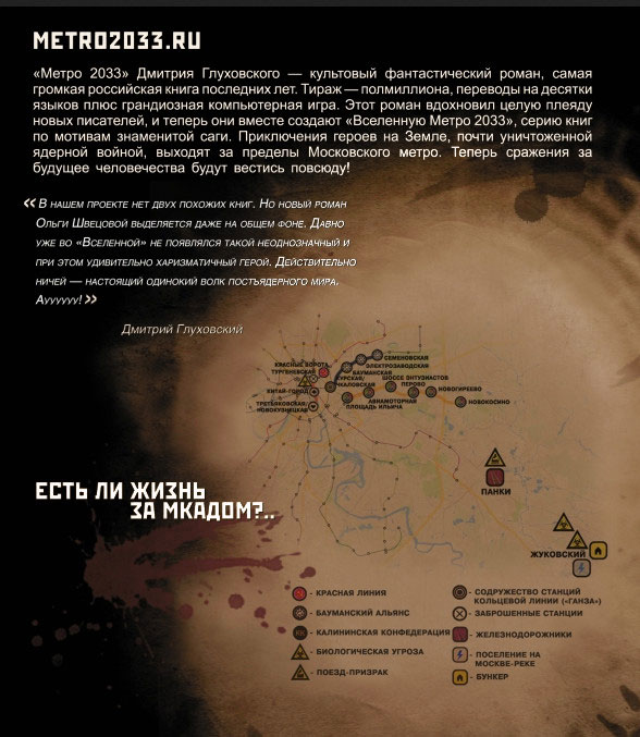 «Метро 2033» Дмитрия Глуховского – культовый фантастический роман, самая обсуждаемая российская книга последних лет. Тираж – полмиллиона, переводы на десятки языков плюс грандиозная компьютерная игра! Эта постапокалиптическая история вдохновила целую плеяду современных писателей, и теперь они вместе создают «Вселенную Метро 2033», серию книг по мотивам знаменитого романа. Герои этих новых историй наконец-то выйдут за пределы Московского метро. Их приключения на поверхности Земли, почти уничтоженной ядерной войной, превосходят все ожидания. Теперь борьба за выживание человечества будет вестись повсюду! Темны туннели Москвы и Питера, Новосибирска и Екатеринбурга, Ростова-на-Дону и Нижнего...
