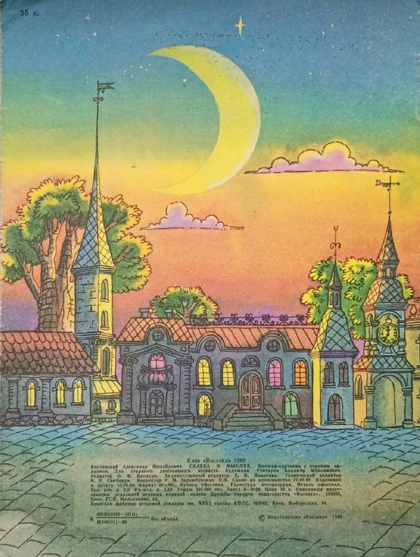 "Сказка о мыслях" — своеобразное продолжение знаменитого мультфильма "Жили-были мысли". Издана в серии "Мультфильм в гостях у книжки". Книжка-картинка с игровым заданием. Художник — Гончаров Владимир Максимович. Здесь мы найдем 20 полностраничных иллюстраций (или 10 разворотов), включая обложку. К сожалению, еще одна мысль, не появившаяся в мультике — Скучная, так и не получила свой портрет… Зато фонтан с каруселью на городской площади работает! И мы узнали название этого сказочного города — Бимбомград. Хотя прототипом, конечно же, стал Киев.