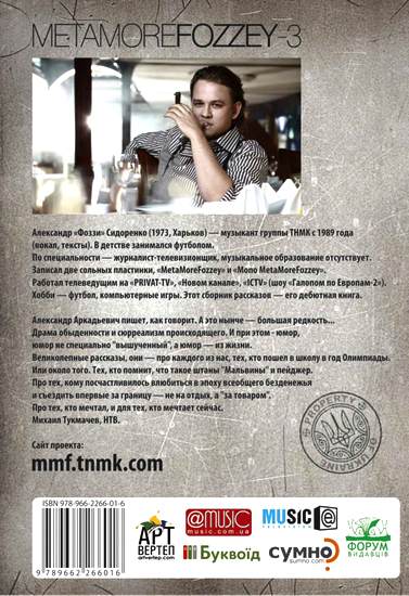 Александр «Фоззи» Сидоренко (1973, Харьков) — музыкант группы ТНМК с 1989 года (вокал, тексты). По специальности — журналист-телевизионщик. Работал телеведущим на «PR1VAT-T V», «Новом канале», «ICTV» (шоу «Галопом по Европам-2»). Хобби — футбол, компьютерные игры. Этот сборник рассказов — его дебютная книга. Александр Аркадьевич пишет, как говорит. А это нынче — большая редкость... Драма обыденности и сюрреализм происходящего. И при этом — юмор, юмор не специально «вышученный», а юмор — из жизни. Великолепные рассказы, они — про каждого из нас, тех, кто пошел в школу в год Олимпиады. Или около того. Тех, кто помнит, что такое штаны «Мальвины» и пейджер. Про тех, кому посчастливилось...
