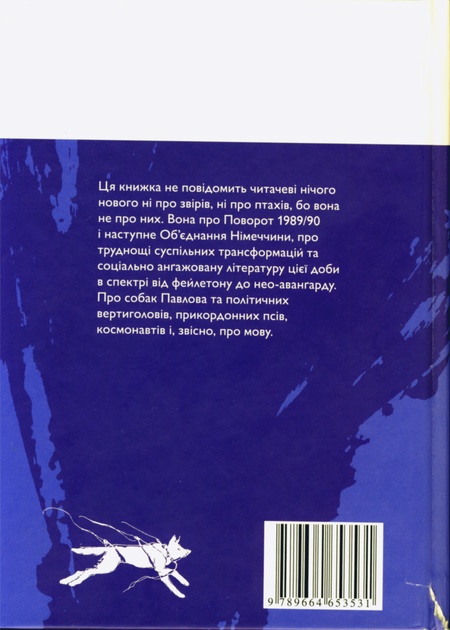 Ця книжка не повідомить читачеві нічого нового ні про звірів, ні про птахів, бо вона не про них. Вона про Поворот 1989/90 і наступне Об'єднання Німеччини, про труднощі суспільних трансформацій та соціально ангажовану літературу цієї доби в спектрі від фейлетону до нео-авангарду. Про собак Павлова та політичних вертиголовів, прикордонних псів, космонавтів і, звісно, про мову.