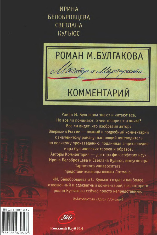 Роман М. Булгакова знают и читают все. Но все ли понимают, о чем говорит эта книга? Все ли видят, что изобразил автор? Впервые в России — полный и подробный комментарий к знаменитому роману: настоящий путеводитель по великому произведению, подлинная энциклопедия мира булгаковских героев и образов. Авторы Комментария — доктора философских наук Ирина Белобровцева и Светлана Кульюс, выпускницы Тартуского университета, представительницы школы Лотмана.