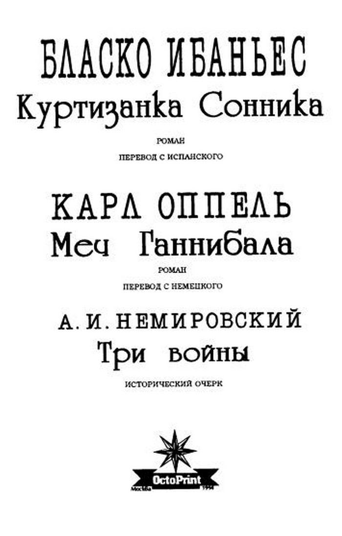 Мощная историческая фигура гениального полководца Древнего мира Ганнибала является связующим звеном всех трех редких произведений, входящих в данный сборник: Ганнибал в Испании - "Куртизанка Сонника", Ганнибал в Италии - "Меч Ганнибала" и исторического очерка А.И.Немировского "Три войны" (римско-карфагенские войны), в котором также центральное место занимает Ганнибал.