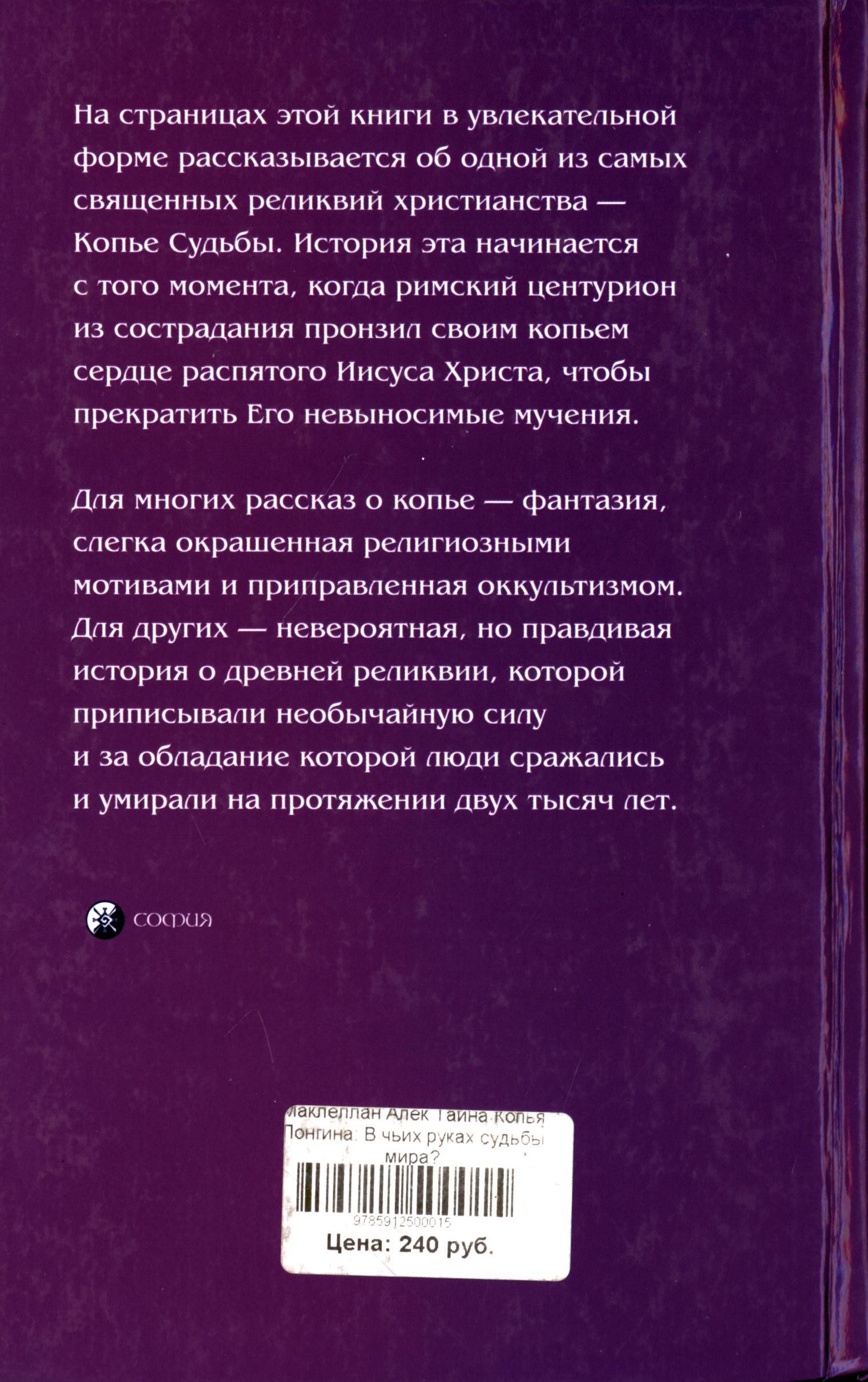 На страницах этой книги в увлекательной форме рассказывается об одной из самых священных реликвий христианства — Копье Судьбы. История эта начинается с того момента, когда римский центурион из сострадания пронзил своим копьем сердце распятого Иисуса Христа, чтобы прекратить его невыносимые мучения. Для многих рассказ о копье — фантазия, слегка окрашенная религиозными мотивами и приправленная оккультизмом. Для других — невероятная, но правдивая история о древней реликвии, которой приписывали необычайную силу и за обладание которой люди сражались и умирали на протяжении двух тысяч лет.